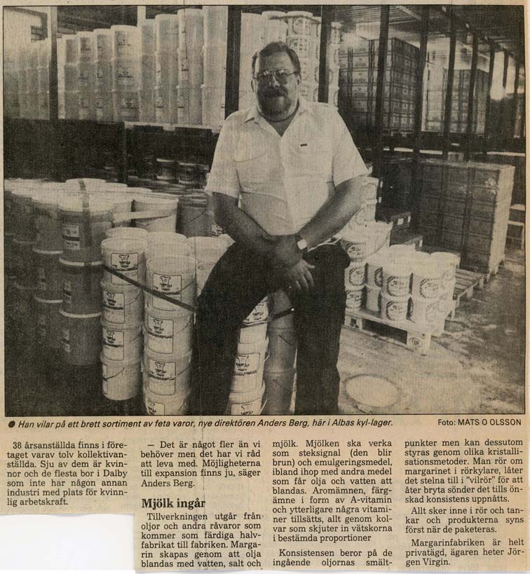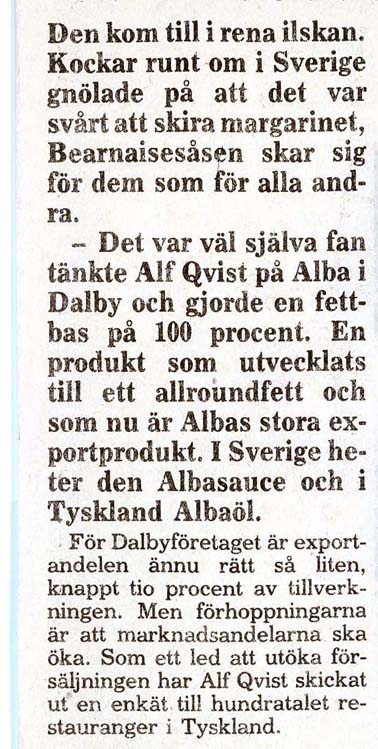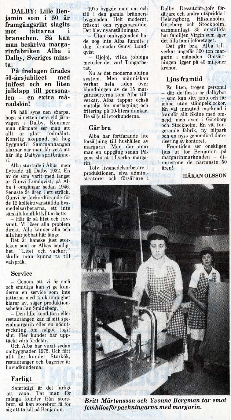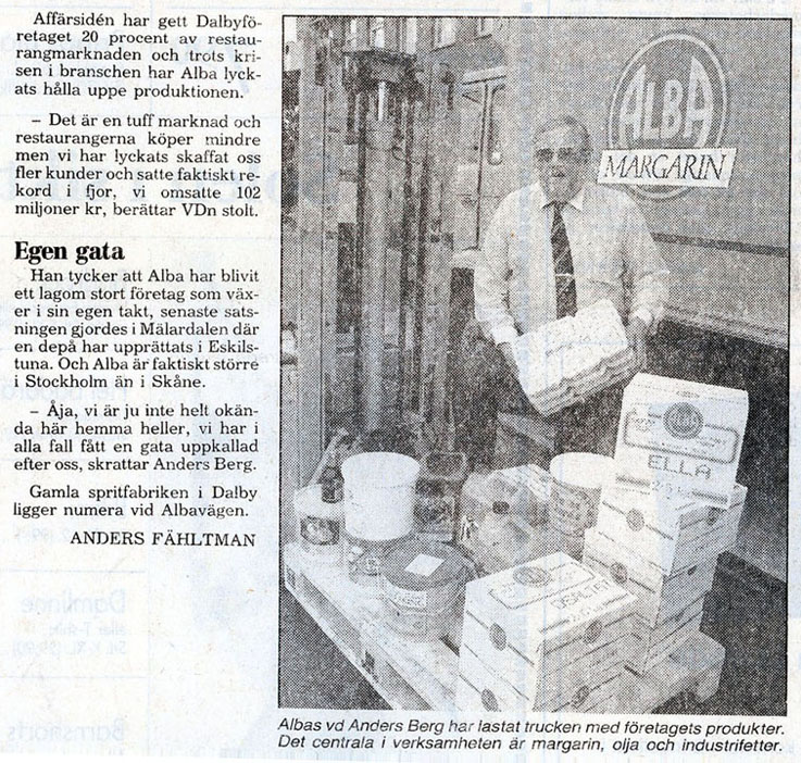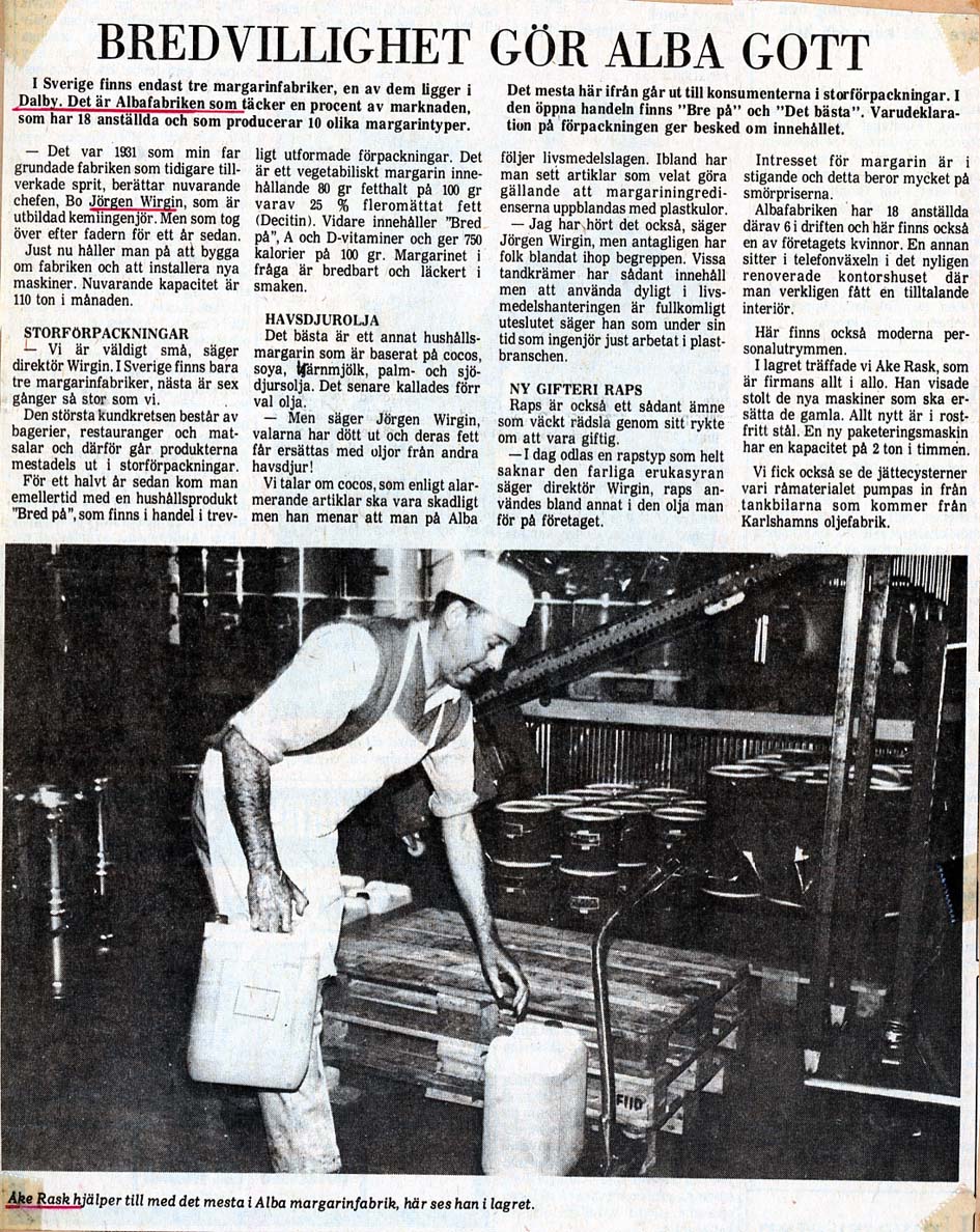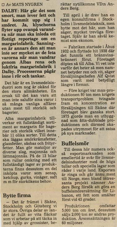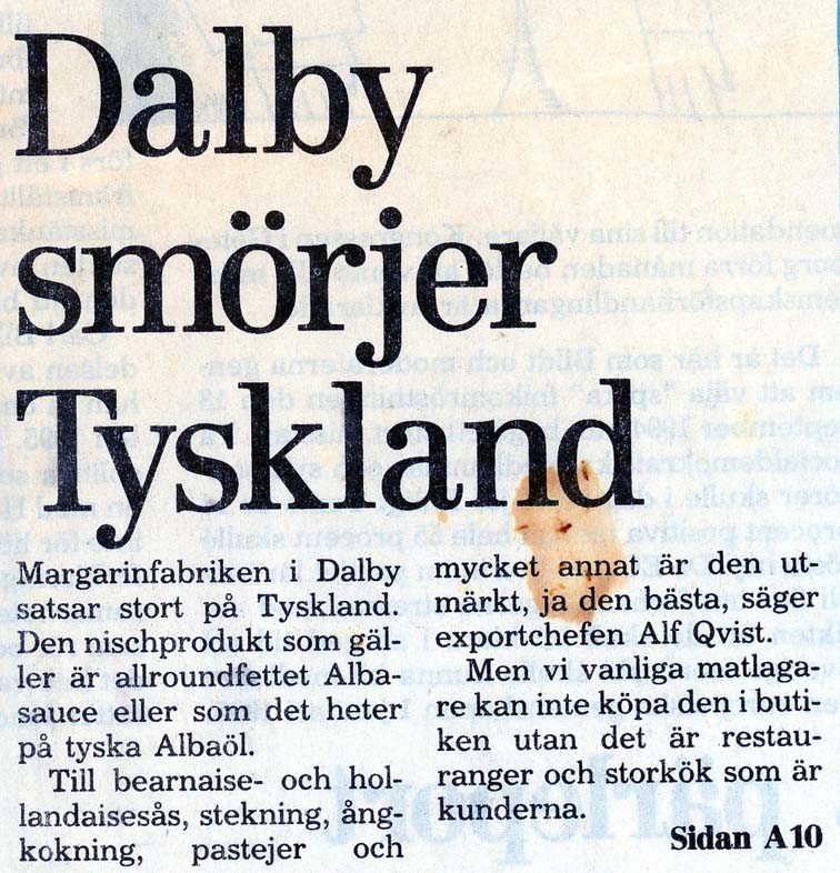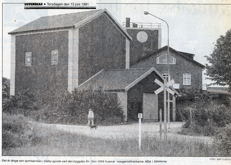 Dalby Spritfabrik 1901 - 1932. 1901-12-14. Aktiebolaget Dalby Spritfabrik ska bildas. 1902-02-01. Dalby Spritfabrik bildas och styrelse utses. 1902-02-04. Styrelsen vill ha in anbud för uppförande av byggnader och maskiner. 1902-08-28. Spritfabriken söker en 1:ste maskinist. 1902-09-23. Tillverkningen på fabriken börjar den 9:e oktober. 1903-01-08. "Brännvin af hvitbetor". 1903-07-03. Stormig bolagsstämma, 1903. 1903-10-19. En kontrollör har utsett för Spritfabriken. 1903-11-09. Under andra halvan av oktober månad tillverkades nästan 190 000 liter brännvin i Dalby. 1903-11-24. Dalby Spritfabriks aktier till salu. 1904-06-18. Spritfabriken söker en nykter maskinist. 1904-07-12. Mycket kraftig kritik från tidningen Arbetet om ingenjör Romén. 1904-07-27. Spritfabriken lägger ut anbud om 275 ton ångkol. 1904-11-07. Under andra halvan av oktober månad 1904 så tillverkades 68 000 liter brännvin i Dalby. 1905-09-21. Dalby Spritfabrik söker arbetare. 1905-09-25. Styrelsen på Spritfabriken vill inte ingå något avtal med Fabriksarbetarförbundet. 1905-09-27. Fabriksarbetereförbundet sätter Dalby Spritfabrik i blockad. 1906-09-21. Spritfabriken söker arbetare. 1906-10-24. 3 personer gör avbön gentemot Fabriksarbetareförbundet. 1906-10-27. Dalby Spritfabrik tar emot vitbetor. 1907-03-19. Avbön från arbetare, som var strejkbrytare år 1905. 1907-09-20. Fabriksarbetereförbundet varnar arbetere för att ta jobb på Dalby Spritfabrik. 1917-11-14. Dalby Spritfabrik lägger anbud på stenkol och koks. 1918-01-10. Dalby Spritfabrik säljer ångkol. 1919-01-16. Dalby Spritfabrik har extra bolagsstämma. 1919-01-30. Dalby Spritfabrik ska säljas. 1919-08-01. Dalby Spritfabrik planerar att gör brännvin av ekollon. 1919-08-11. Det blir inget av med ekollonbrännvinet. 1920-10-18. De tre skånska bet-brännerierna vill återigen kunna göra brännvin av sockerbetor. 1921-04-07. Spritfabriken vill upprätta kontrakt om odling av betor. Mejerifabriken Alba 1934 - 2025. 1973. Bredvillighet gör Alba gott. 1982-01-04. Dalbys margarinfabrik klarar lågkonjukturerna. 1982-10. De firade 50 års framgångsrik kamp. 1985-07-22. Här går det som smort. 1991-06-16. 60-årsfest på fettfabriken. 1993-10-12. Dalby smörjer Tyskland. |