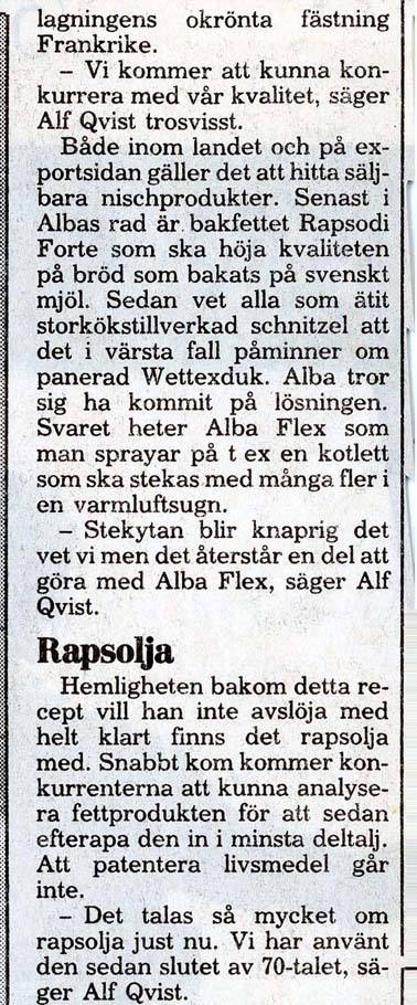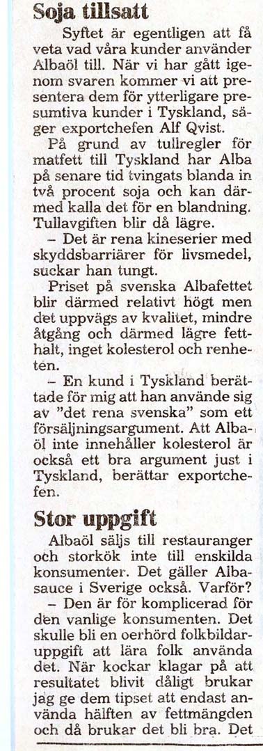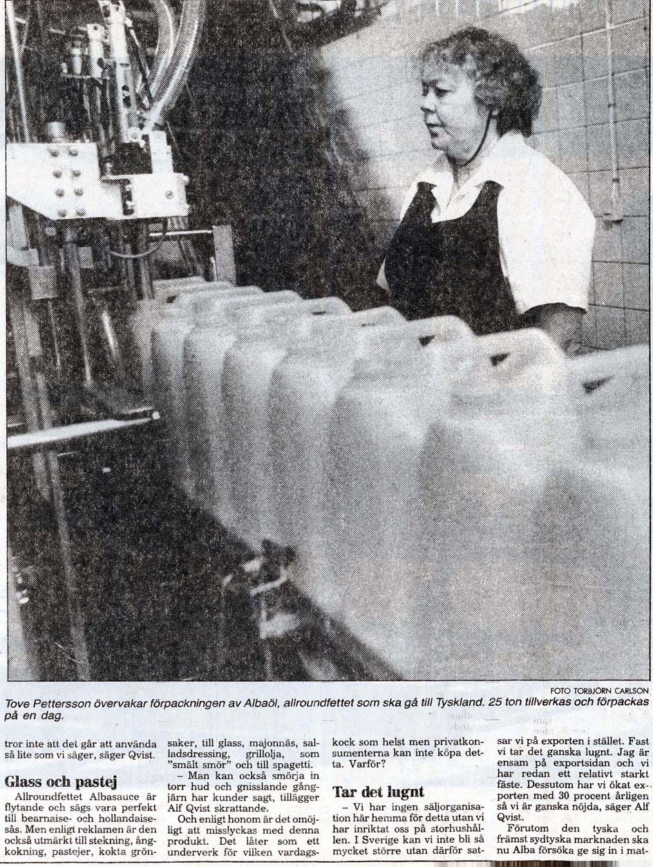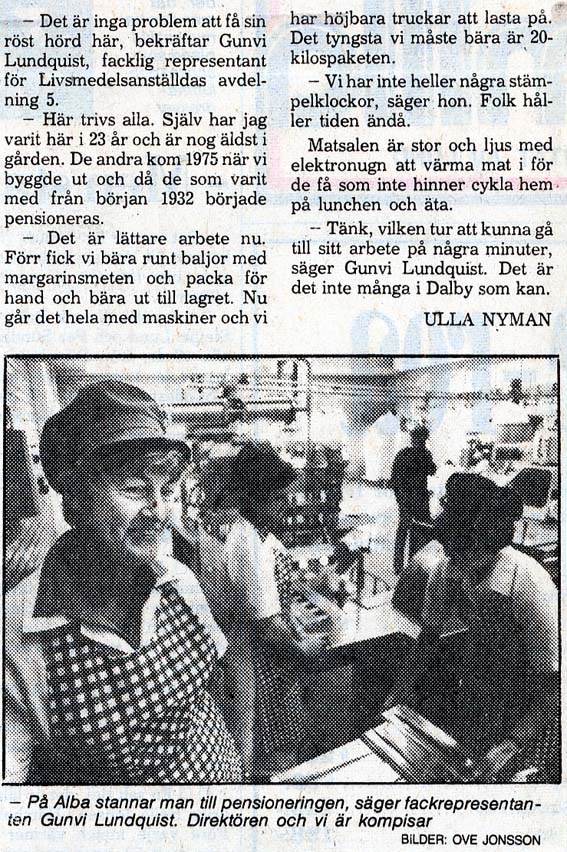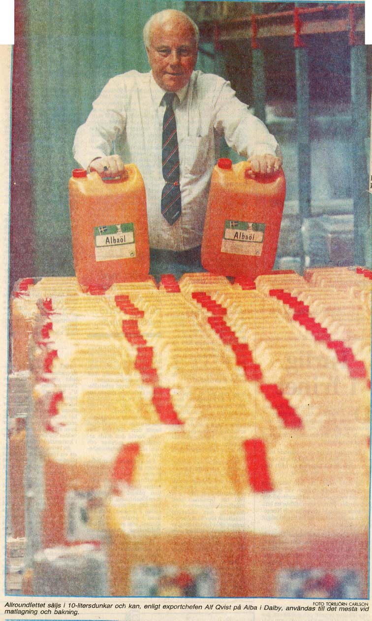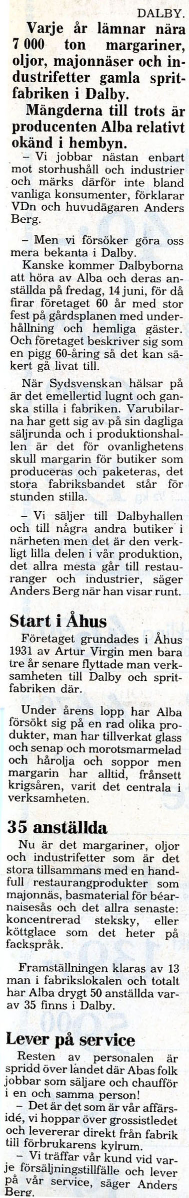 Dalby Spritfabrik 1901 - 1932. 1901-12-14. Aktiebolaget Dalby Spritfabrik ska bildas. 1902-02-01. Dalby Spritfabrik bildas och styrelse utses. 1902-02-04. Styrelsen vill ha in anbud för uppförande av byggnader och maskiner. 1902-08-28. Spritfabriken söker en 1:ste maskinist. 1902-09-23. Tillverkningen på fabriken börjar den 9:e oktober. 1903-01-08. "Brännvin af hvitbetor". 1903-07-03. Stormig bolagsstämma, 1903. 1903-10-19. En kontrollör har utsett för Spritfabriken. 1903-11-09. Under andra halvan av oktober månad tillverkades nästan 190 000 liter brännvin i Dalby. 1903-11-24. Dalby Spritfabriks aktier till salu. 1904-06-18. Spritfabriken söker en nykter maskinist. 1904-07-12. Mycket kraftig kritik från tidningen Arbetet om ingenjör Romén. 1904-07-27. Spritfabriken lägger ut anbud om 275 ton ångkol. 1904-11-07. Under andra halvan av oktober månad 1904 så tillverkades 68 000 liter brännvin i Dalby. 1905-09-21. Dalby Spritfabrik söker arbetare. 1905-09-25. Styrelsen på Spritfabriken vill inte ingå något avtal med Fabriksarbetarförbundet. 1905-09-27. Fabriksarbetereförbundet sätter Dalby Spritfabrik i blockad. 1906-09-21. Spritfabriken söker arbetare. 1906-10-24. 3 personer gör avbön gentemot Fabriksarbetareförbundet. 1906-10-27. Dalby Spritfabrik tar emot vitbetor. 1907-03-19. Avbön från arbetare, som var strejkbrytare år 1905. 1907-09-20. Fabriksarbetereförbundet varnar arbetere för att ta jobb på Dalby Spritfabrik. 1917-11-14. Dalby Spritfabrik lägger anbud på stenkol och koks. 1918-01-10. Dalby Spritfabrik säljer ångkol. 1919-01-16. Dalby Spritfabrik har extra bolagsstämma. 1919-01-30. Dalby Spritfabrik ska säljas. 1919-08-01. Dalby Spritfabrik planerar att gör brännvin av ekollon. 1919-08-11. Det blir inget av med ekollonbrännvinet. 1920-10-18. De tre skånska bet-brännerierna vill återigen kunna göra brännvin av sockerbetor. 1921-04-07. Spritfabriken vill upprätta kontrakt om odling av betor. Mejerifabriken Alba 1934 - 2025. 1973. Bredvillighet gör Alba gott. 1982-01-04. Dalbys margarinfabrik klarar lågkonjukturerna. 1982-10. De firade 50 års framgångsrik kamp. 1985-07-22. Här går det som smort. 1991-06-16. 60-årsfest på fettfabriken. 1993-10-12. Dalby smörjer Tyskland. |