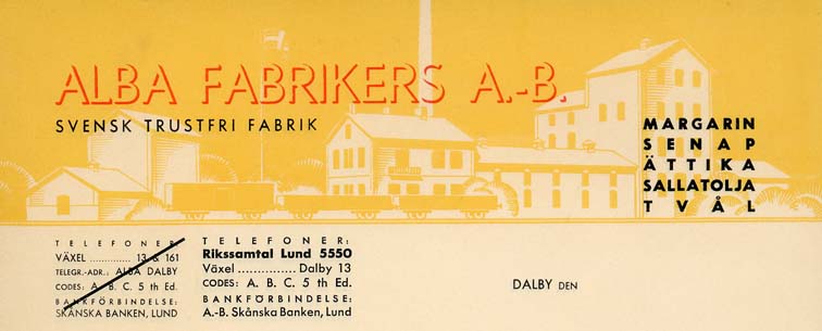 1930. En märklig sak är, att inget av det, som står beskrivet på kartan, finns kvar: Folkets Hus, Tegelbruket, Spritfabriken, Mejeriet och järnvägen. ![]() En av trotjänarna, och en av förgrundsfigurerna i Dalby under 1900-talets första hälft var Dalby-nestorn Kjell-Åke Roos farfar: Johannes Roos. ![]() Dalby Spritfabrik stängdes 1932, men två år senare övertogs lokalerna av Mejerifabriken Alba. Nedan finns ett flygfoto över Alba från dess första år. Därunder huvudet på ett brevpapper. ![]() ![]() |