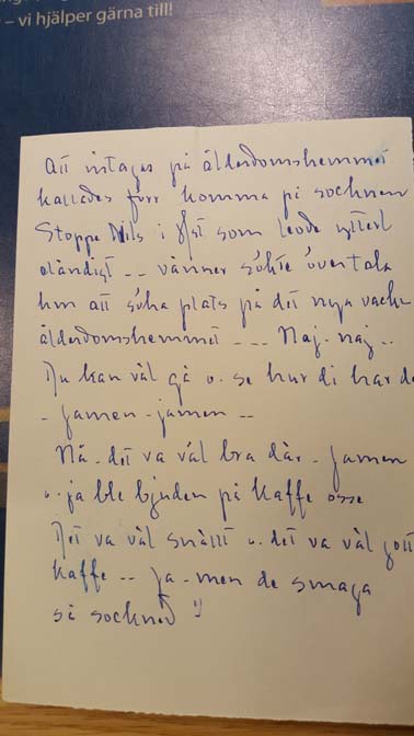![]() Tolkning: Att intagas på ålderdomshemmet kallades förr: komma på socknen. StoppeNils i Hällestad levde ytterst eländigt. Vänner sökte övertala honom att söka plats på det nya vackra ålderdomshemmet. ... Naj... naj... Du kan väl gå och se hur di har det. ...Jamen...jamen... - Nå, det var väl bra där. ...jamen, ja ble bjuden på kaffe osse... Det var väl snällt o det va väl gott kaffe? ...jamen de smaga så sockned... |